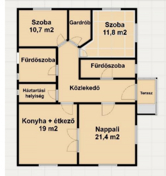 egy nappali, két fürdőszoba, mindegyikben WC. Valamint két tároló helyiség, gardrób.