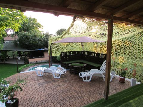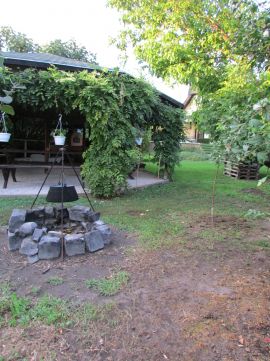 30m2 kiülő asztalokkal és az oszlopokhoz lila akáccal telepített, ahol akár 22 ember is elfér