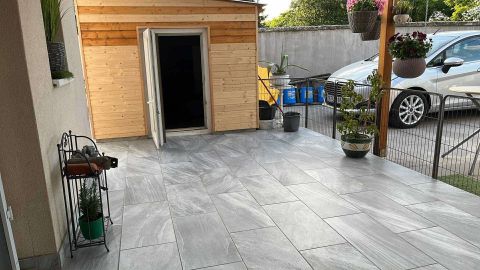 Kívül szigetelve lett, a külső terasz körbefut az épületen, padlólapozott. 70m2 .
