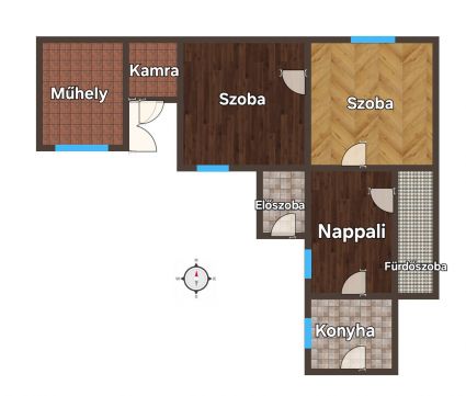 A lakásban megtalálható kettő 16 négyzetméteres hálószoba, egy nappali, egy fürdőszoba illemhelyiséggel, két előszoba, amelyből az egyik legutóbb konyhaként funkcionált, a másik előszoba pedig egyenesen az egyik hálószobába visz az udvarról. Tartozik a házrészhez egy műhely, mellette egy kamra, illetve egy 75 négyzetméteres előkert, mely kocsibeállónak is tökéletes átalakítva, vagy körbekerítve kutyust tartani.