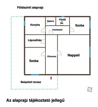 Földszint: beépített előtér+ terasz, közlekedő, nappali, 2 szoba, konyha, kamra, zuhanyzó+ wc