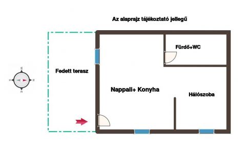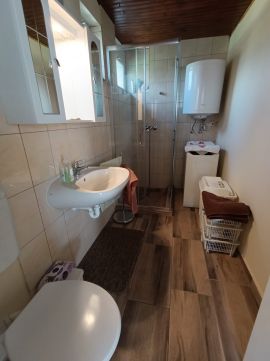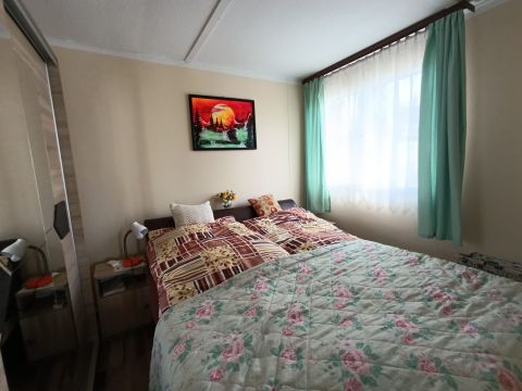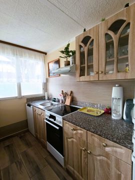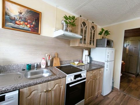 A nyitott konyha biztosítja a nagyobb teret. A konyha jól felszerelt, jó állapotú. A hálóban egy nagy franciaágy és egy nagy gardróbszekrény van ahova minden elfér. A fürdőben zuhanyzó van ,a mosógép is kényelmesen befér, és a wc is itt helyezkedik el.