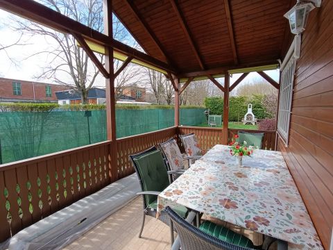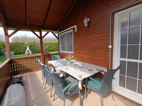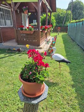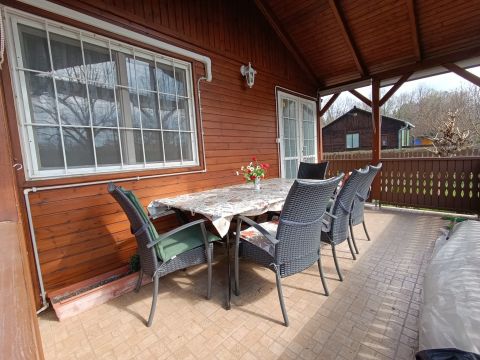 A 337m2-es körbekerített telekre lépve ez a kis faház fogad minket. Tágas teraszon a nagy asztalnál mindenki elfér.