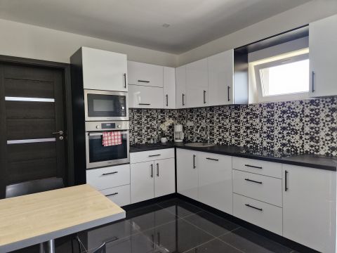 Die Beheizung des Hauses erfolgt über einen Elektrokessel und eine Fußbodenheizung sowie drei Klimaanlagen, die für die richtige Temperatur in der Immobilie sorgen. Im Kaufpreis inbegriffen ist eine moderne, hochglänzende weiß-schwarze Küchenmöbel mit eingebauten Geräten, die perfekt zum eleganten Stil des Hauses passen.