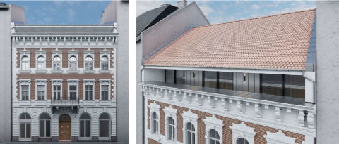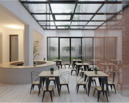 A végső kialakítás során reggeliző, kiszolgáló helyiségek, irodák, részben fedett udvar lesz, az alagsorban konyha-reggeliző, a földszinten közösségi tér, az emeleteken pedig önálló vendégszobai egységek lesznek.
