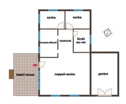 A teljes ház hasznos alapterülete 72 négyzetméter, mely magába foglal egy 32 négyzetméteres nappalit, ide érkezünk meg egyből a nagyon hangulatos 15 négyzetméteres fedett teraszról belépvén a házba. A nappaliból nyílik a már említett pince lejaró, valamint egy közlekedő is, ahonnét minden más helyiséget, úgy mint a konyha- étkezővel, fürdőszoba Wc-vel, valamint 2 szoba közelíthető meg.