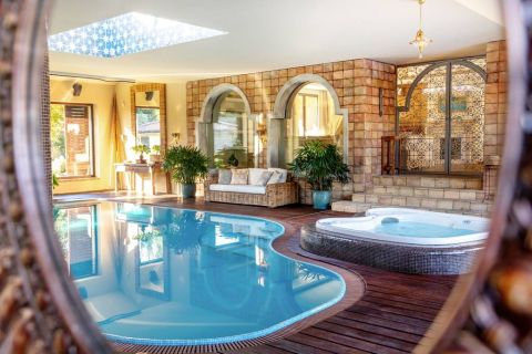 ...és a SPA: az elegáns kapun belépve egy „török fürdőben” találjuk magunkat, ahol egy 9 méter hosszú medence, egy jacuzzi, egy szauna, egy gőzfürdő és egy központi zuhanyzó is helyet kapott. Mindezt egy szeparált zuhanyzós mosdó-öltöző-rakodó együttes teszi még kényelmesebbé. A medence mennyezetén egy üvegkupolán keresztül lehet az égre tekinteni, ez a kupola egyébként a nagyobbik, 55 négyzetméteres fenti teraszt ékesíti.