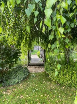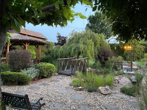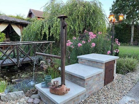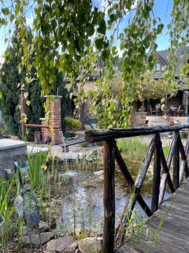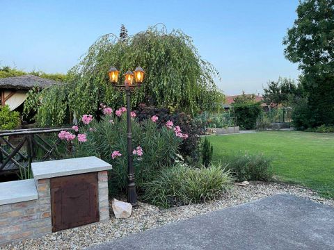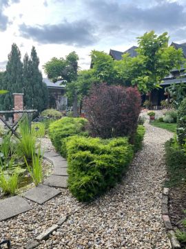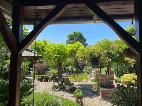 Parkosított udvar, koros fákkal, virágzó növényekkel, teljes öntözőrendszerrel.