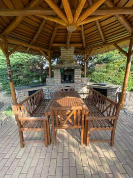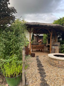 Nádfedeles kerti sütögető, beépített gáz főzőlappal és mosogatóval