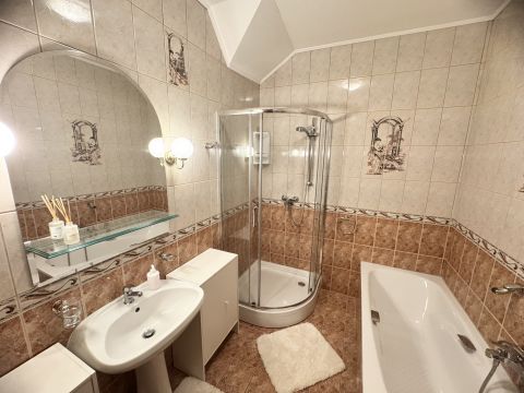 2000-ben épült, 230 m²-es, háromszintes ikerház bal oldali fele, 1079 m²-es, gondozott, parkosított közös kerttel.