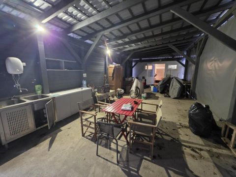 A két konténer között egy 50 m²-es, beton aljzattal rendelkező, ponyvázott, berendezett terasz található vendégek, kiülős programok, közösségi tér számára ideális.