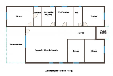 Az önálló családi ház 4 hálószobával, gardróbbal, amerikai konyhás nappali étkezővel, fürdőszobával, mellékhelyiséggel, háztartási helyiséggel, tágas előszobával kényelmes otthont biztosít. A bejárat fedett résszel rendelkezik, a nappaliból fedett teraszra léphetünk ki.