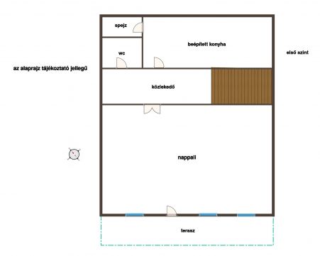 - közlekedő, konyha, spejz, nagy méretű nappali, wc mosdóval, terasz