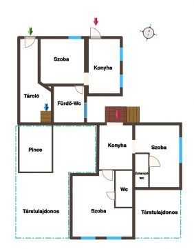 A patinás épületben jelenleg 2 külön bejáratú lakrész található. A nagyobb részben 2 szoba saját fürdőszobával és egy konyha kerólt kialakitásra. A kisebb részben egy szoba, egy konyha és egy fürdőszoba van. Különleges adottságai révén családi háznak , vendégháznak és apartmanok kialakítására is egyaránt alkamas lehet. Az ingatlanhoz kerthelyiség is tartozik, ahol a parkolás is biztosított. A ház egy pincével és egy tárolóval is rendelkezik.