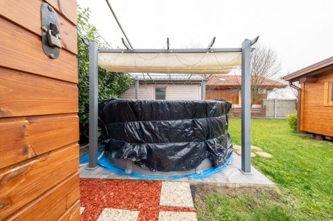 Fűtött, fémpalástos medence és gondozott, téliesített kert