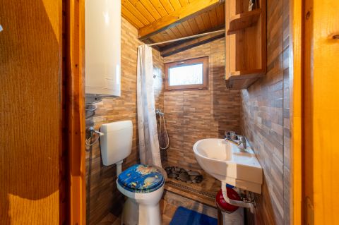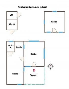 A 362 m²-es telken elhelyezkedő ingatlan két különálló épületből áll. A főépület praktikus elosztású: két világos szoba található benne, melyek közül az egyik a konyhával egy légtérben helyezkedik el, míg a másik nappaliként funkcionál. A fürdőszoba WC-vel egy helyiségben került kialakításra. A villany- és vízközmű megtalálható az ingatlanban. A déli fekvésnek köszönhetően a belső terek egész nap világosak, a nappaliból pedig közvetlen kijárat nyílik a fedett teraszra, amely kellemes kapcsolatot teremt a kerttel.