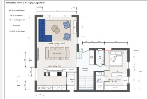 földszint: nappali-ebédlő-konyha, szoba, előszoba, panorámás terasz, gardróbszoba, fürdőszoba, wc, háztartási helyiség.
