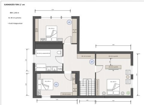 emelet: 3 hálószoba, 1 fürdőszoba, panorámás terasz, közlekedő