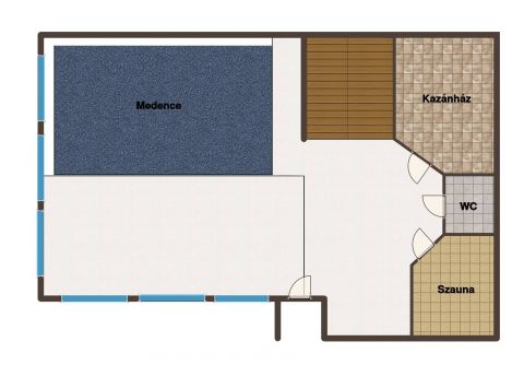 - Beltéri, fűthető 9×3 m-es medence, mellette bárpult és zuhany