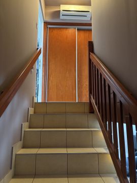 A nappali és a szobák laminált parkettával, a többi helyiség és az emeletre felvezető beton lépcső is, járólappal fedett.