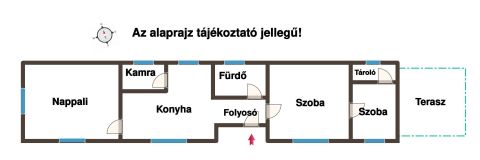 Felosztás szempontjából nappali plusz kettő szobából áll, amiből az egyik fél szoba, ebből nyílik egy kis tároló.