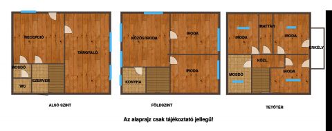 Alsó szintjén recepció + nagy tárgyaló + mosdó, középső szintjén 2 iroda/szoba, konyha és egy nagyobb, 17 nm-es közös irodai tér/nappali, míg legfelső szintjén 3 iroda/szoba és mosdó található.