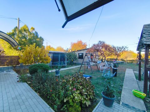 A 1700 m²-es, parkosított telek gyümölcsfákkal és szőlővel beültetett, részben térkövezett, és igazán kellemes hangulatot áraszt. Az udvarban található egy egyállásos garázs, pince, padlásfeljáró, valamint egy fedett kiülő, ahol jólesik megpihenni, vagy akár családi ebédet tartani a friss levegőn.
