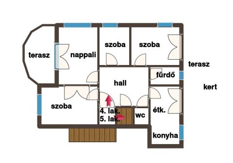 Az alsó szinten kettő kétszobás lakás van, az egyik nagy teraszos, kertkapcsolatos, ill. egy egyszobás lakás.