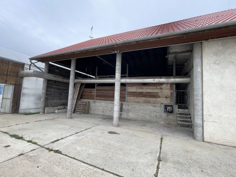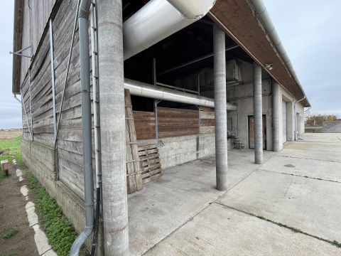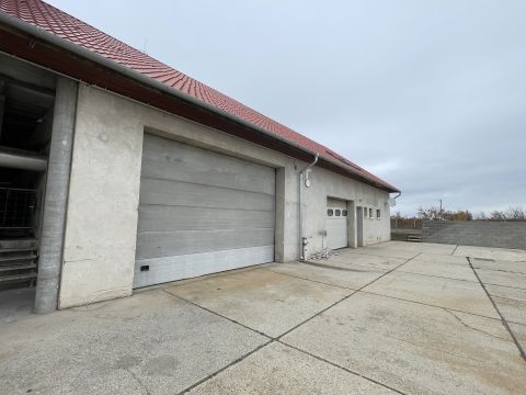 Téglaépület: 33×11 m, manipuláló tér, 23 raklapos hűtő, szociális helyiségek, tetőtérben 3 szoba, fürdő, konyha (120 m²)