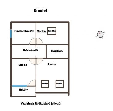 Az emelet (60 nm) 3 szoba, gardrób, fürdőszoba-WC, előtér helyiségeket foglal magában és egy erkély tartozik hozzá.