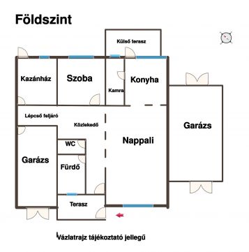 A földszinten (117 nm) 1 szoba, nappali, konyha, kamra, fürdőszoba, WC, előszoba és hátsó terasz található.