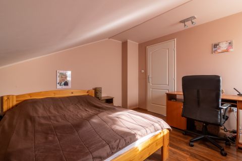 A felső szinten egy amerikai-konyhás, 2 hálószobás lakás található külön fürdővel és wc-vel, amely irodának is tökéletes.