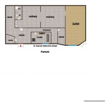 Az épületben kialakítottak egy igényes eladó teret/üzletet, két műhely részt, irodát, több raktár helyiséget, közlekedő résszel és WC-t, mosdóval, tusolóval.