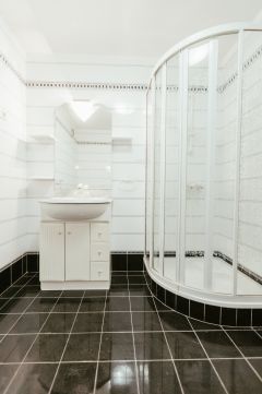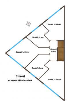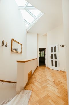 Az elegáns márvány burkolatú lépcsőt egy hatalmas tetőablak világítja meg az emeletre vezető szakaszon. Az emeleten három tágas hálószoba, egy gardróbszoba és fürdőszoba biztosítanak helyet az egész családnak vagy vendégeknek.