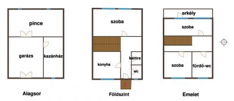 Két szinten találunk 3 szobát, külön wc-t, fürdőszobát, valamint konyhát és egy kamrát.