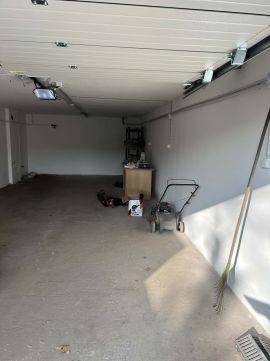 Az épület alatt egy 40 m2-es dupla garázs kapott helyet, amit elektromos Hörmann kapuval szereltek, és amelyet elektromosan nyíló utcai kapun keresztül lehet megközelíteni.