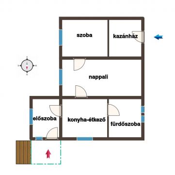 -A lakóépület 44 nm hasznos alapterületű, elrendezése: 2 szoba, konyha, tágas fürdőszoba, előszoba és külön kazánház.