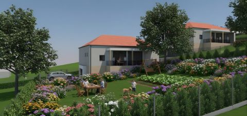 Az udvarra belépve a szemet az utcafronti 3D kerítés, a térkövezett gyalogos és gépkocsi bejáró fogja meg. A gépkocsitárolásról szekcionált garázskapuval ellátott garázs gondoskodik, az elektromos nagykapu tovább növeli a kényelmet. Otthona környezete nemcsak szép, de biztonságos is, köszönhetően a megbízható kivitelezésnek és az elővigyázatosan megtervezett építési anyagoknak, mint a 30 cm vastag Porfix falak, a 15 cm vastag EPS hőszigetelés és a 30 cm vastag üveggyapot tetőhőszigetelés.