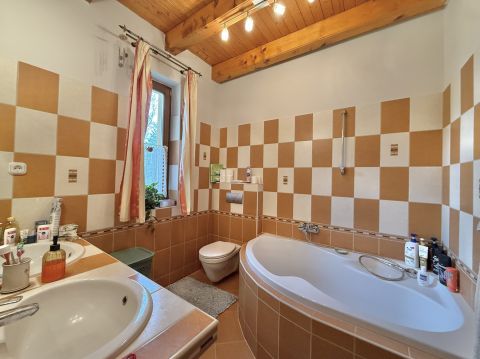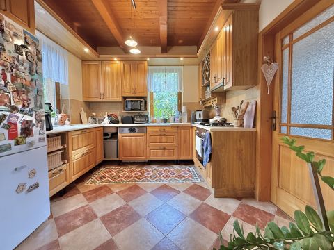 Az alagsorban tágas garázs, kamra és tároló biztosít praktikus tárolási lehetőségeket. A ház egészét karakteres, látszó fagerendák díszítik. A kellemes hőérzetről padlófűtés, hűtő-fűtő klíma és hangulatos fatüzelésű kandalló gondoskodik.