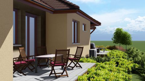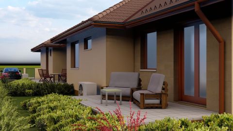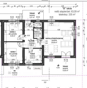 Kialakítása: 2 szoba, fürdő, külön wc, előtér, tároló, nappali+étkező konyha, 18 m2 nyitott terasz.