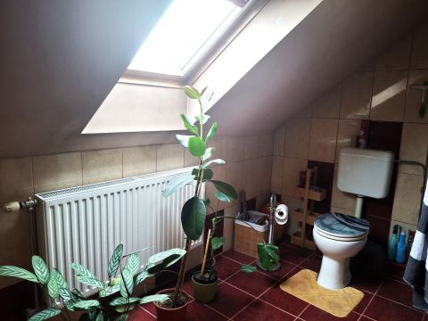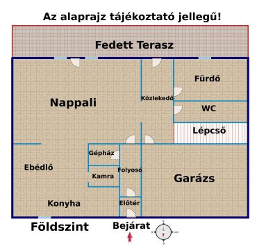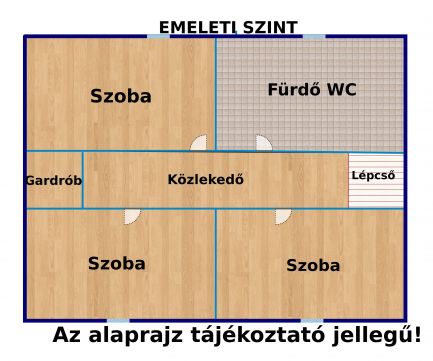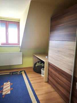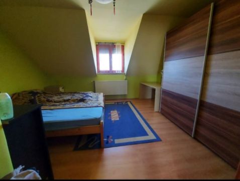 Az épület tetőtér beépítéses, lakáson belül szép falépcső visz az emeleti részre. A földszinten került kialakításra a kb 40 nm-es élettér, a konyha-étkező nappali egy légtérben , külön nyíló fürdő, wc, kamra , előszoba helyiségekkel. A ház jobb oldali,i részen , elektromos kapuval nyílik a garázs , innen közvetlenül egy ajtón bejuthatunk a lakótérbe. .Egyébként a garázs kellőképpen alkalmas arra is, hogy oldalt bepolcozva tárolni lehessen olyan dolgokat, amit nem mindig használ az ember. , A ház emeleti részen a közlekedő és 3 külön nyíló hálószoba, egy gardrób és egy fürdőszoba került kialakításra . Ez az elrendezés kényelmes akár 4-5 tagú család részére is.