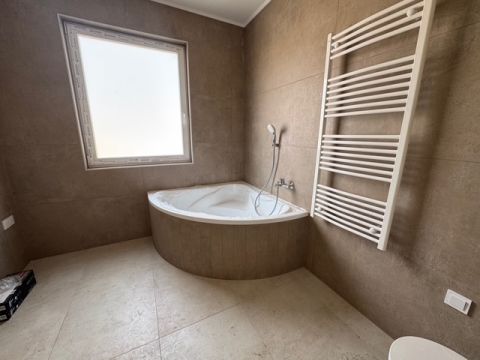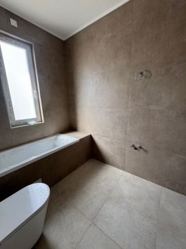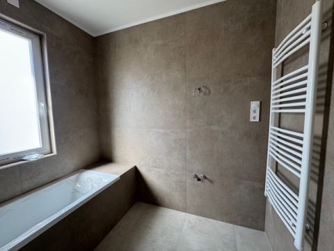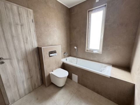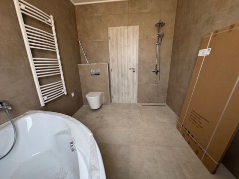 A ház egyik legnagyobb erőssége az egyedi, két fürdőszobás kialakítás, amely valódi kényelmet biztosít a mindennapokban. Az egyik fürdőben zuhanyzó és kád is helyet kapott, így a család minden tagjának igénye kielégíthető, míg a másik, kizárólag a szülői hálószobából nyíló kádas fürdő egy intim, privát életteret biztosít.
