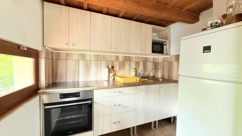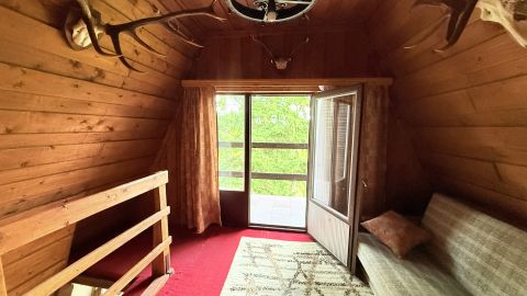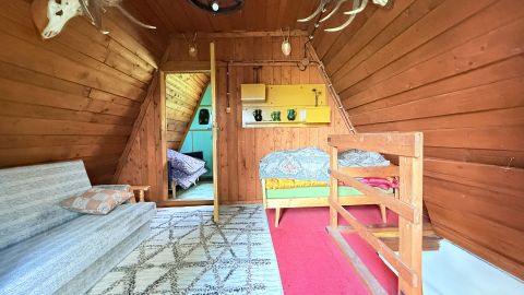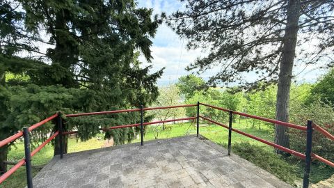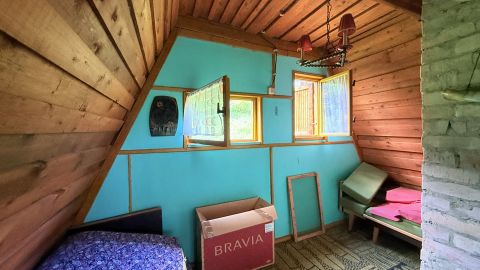 A ház nyaralónak épült, alul tégla, felül fa szerkezetű, átlagos állapotú. Alul található egy nappali-étkező, amiből nyílik egy kis konyha, és egy zuhanyzós fürdőszoba. A konyhát 2-3 éve újították fel. A fűtésről egy csodaszép sparhelt gondoskodik, ami főzésre is alkalmas. A tetőtérben egy nappali és egy kis háló található. Csodaszép panoráma nyílik a Duna felé mindkét szintről.