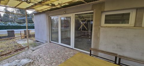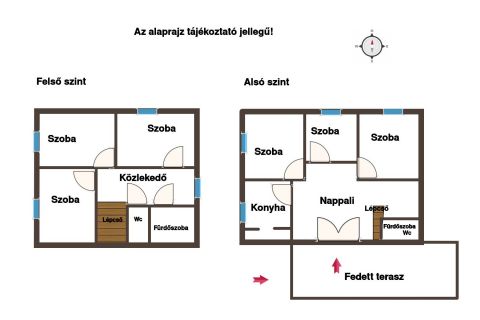 A földszinten található a nappali, ami közvetlenül a kertre néző, fedett teraszhoz kapcsolódik, 3 szoba, konyha, és fürdőszoba-wc.