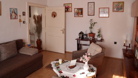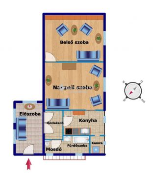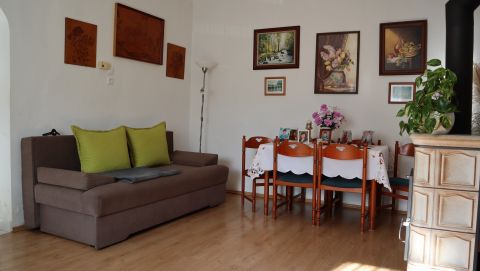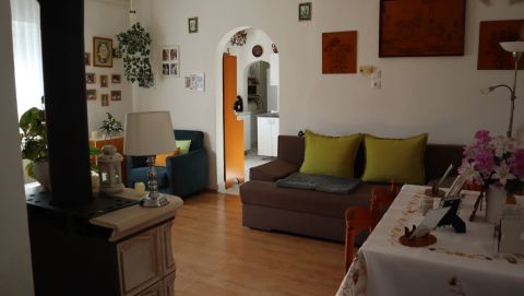 A 80 négyzetméteres lakóházba egy tágas, napfényben úszó beépített verandán keresztül lépünk be, amely már érkezéskor megalapozza az otthon barátságos atmoszféráját. A közlekedőből külön mosdó és fürdőszoba nyílik, majd egy világos, arányos méretű konyhába érkezünk, amelyhez praktikus kamra is kapcsolódik. Innen két, egymásból nyíló, egyenként 24 négyzetméteres, kifejezetten tágas szoba érhető el; a laminált parkettával burkolt helyiségek világosak, jól berendezhetők, harmonikus életteret biztosítanak.