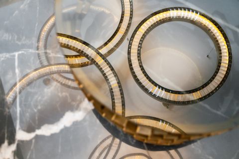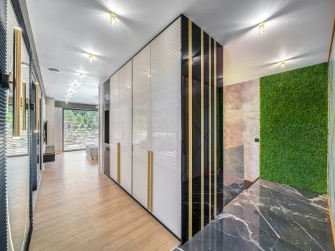 - a 3D-s matt- és fényes arany faldekorok, falkárpitok és a dekor panelek mellett a beépített bútorok CNC mart frontjainak mintájában is visszaköszönnek a függőleges- és diagonális csíkok, így hozva létre a tökéletes összhangot