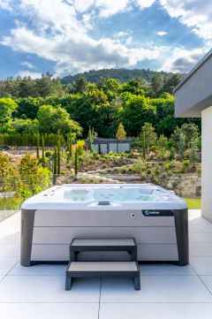 Az ingatlan panorámás teraszán maximális feltöltődést biztosít a Hotspring Envoy sós vizű jakuzzi. Az Envoy az egyik legsikeresebb HotSpring modell, hiszen az 5 férőhelyes masszázsmedence már rendelkezik fekvőhellyel is és a beltere is rendkívül tágas. A jakuzzi vezérlése egy kivehető érintőképernyős kezelőpanel segítségével történik, melyen keresztül szabályozhatóvá válnak abefúvók működése, a vízhőmérséklet, valamint a jakuzzi világítása is. A masszázsmedencetermo tetejének mozgatásához, a nyitáshoz és záráshoz egyszerű megoldást jelent az alumíniumból készült tetőemelő szerkezet, melyet a medence oldalán lévő gomb segítségével működtethetünk.