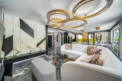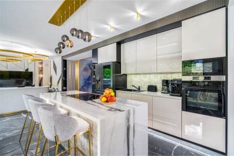 Az ingatlan magas minőségű, exkluzív belsőépítészeti megoldásokkal rendelkezik. Az ArtDeco stílus jegyeit felölelve az arany, a bézs, az antracit és a lila árnyalatai teszik izgalmassá és egyedivé a ház teljes arculatát. A prémium kategóriás olaszországi hideg- és melegburkolatok mellett egyedi gyártású kép- és faltapéták, SICIS festett üveg faldekorok, Art Deco stílusú falpanelek, élő izlandi zuzmóból álló zuzmófalak varázsolják jellegzetessé és harmonikussá a ház belső kisugárzását. Az ingatlan belsőépítészeti megoldásai a legnagyobb luxus és exkluzivitás életérzését adják az ott élőknek: