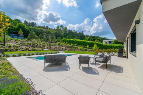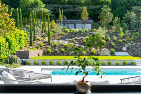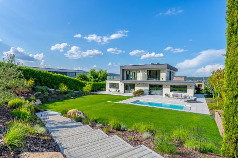 - az ingatlan kertjének tervezése során kiemelt szempont volt, hogy az ingatlan egyedi és innovatív belső megjelenéséhez egy páratlan, mediterrán- és örökzöld növényfajokban gazdag kert is párosuljon. A kiépített öntözőrendszer működtetésével a növények a hazai éghajlati viszonyokhoz alkalmazkodva egész évben változatos színekben, illatokban és formákban pompáznak.