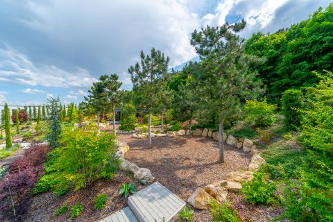 - a növényfajok különböző egységeket alkotva kerültek elhelyezésre (mediterrán rész, sziklakert, magaságyásban kialakított konyhakert, valamint a telek mögött elhelyezkedő fenyőerdő átvezetéseként osztrák feketefenyők rendszere)